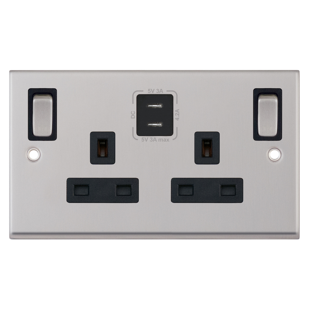 7MPRO-268 13 Amp Socket Outlet 2 Gang Switched SP Outboard Rockers + 2 Earth Terminals, 2 x USB Type C (3A / 3A)